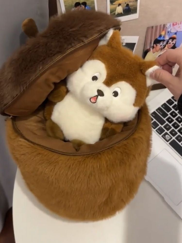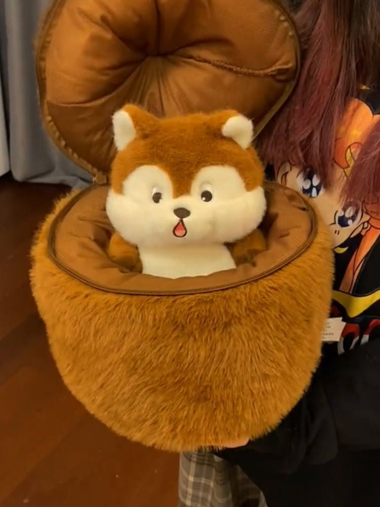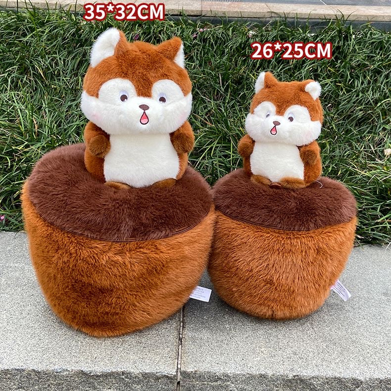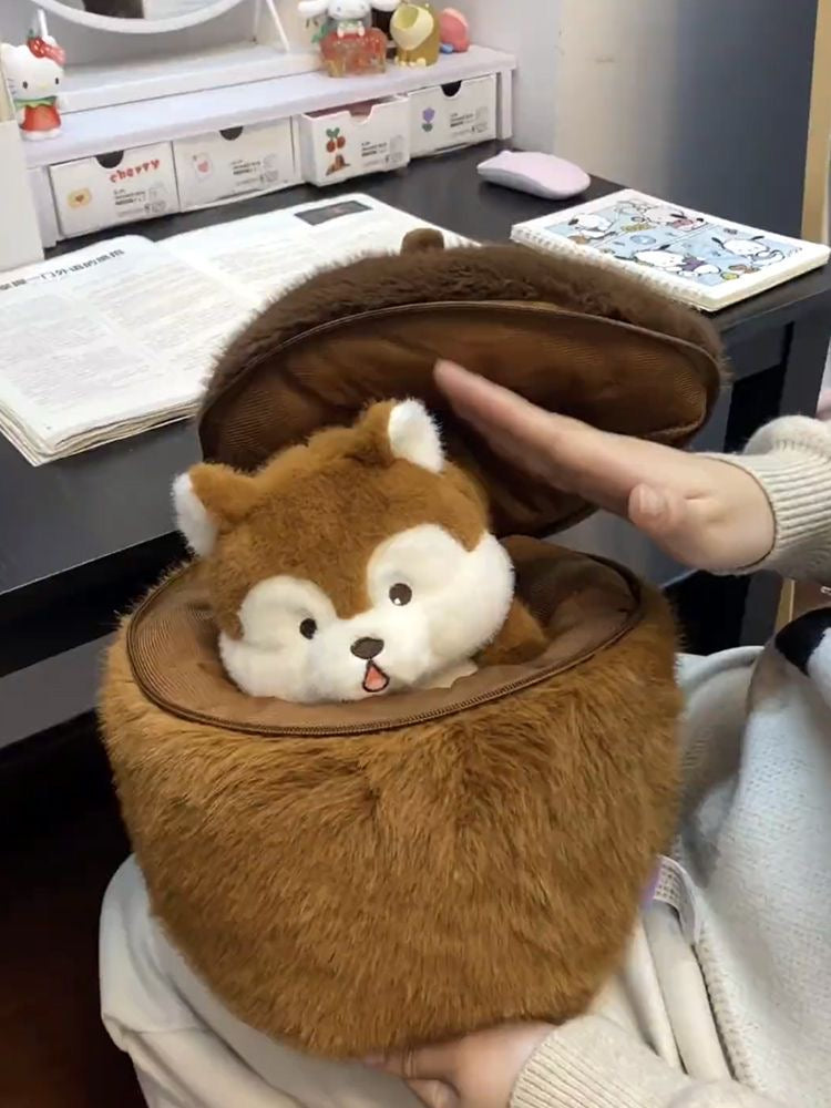 Una ardilla tímida escondida en una bellota.